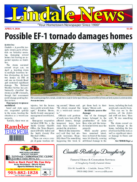 Lindale—A possible tornado struck parts of Lindale on Saturday morning, damaging several homes...